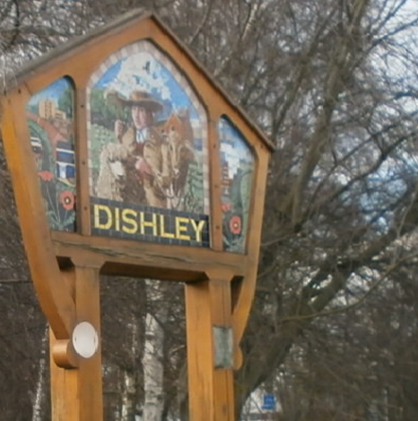 | A village sign for Dishley was officially unveiled on 9th July 2003 at the corner of Warwick Way and Derby Road, It is currently being refurbished. Artist Roger Hutchinson and Robert Bakewell Primary School in Dishley worked on the project for eighteen months. A huge concrete base supported the heavy golden oak frame covered with thirty dazzling mosaics that showed local fauna and flora from quacking ducks to slimy snails. |